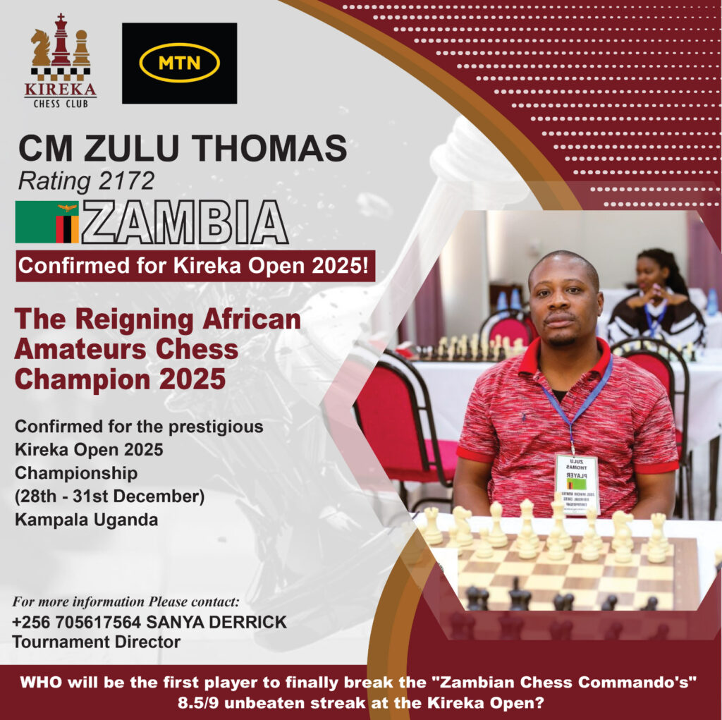 KAMPALA, UGANDA – The highly anticipated Kireka Open 2025 Chess Championship is set to explode with international firepower as the reigning African Amateurs Chess Champion, Candidate Master (CM) Thomas Zulu from Zambia, confirms his participation!